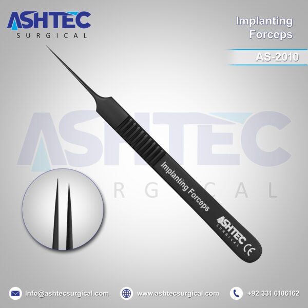 Hair Implanting Forceps, Straight, 11cm, Sharp Tip, Black Coating, Finish (AS-2010)