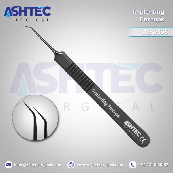 Hair Implanting Forceps, 45° Angled with 5mm Tip, 11cm, Sharp Tip, Black Coated Finish (AS-2005)