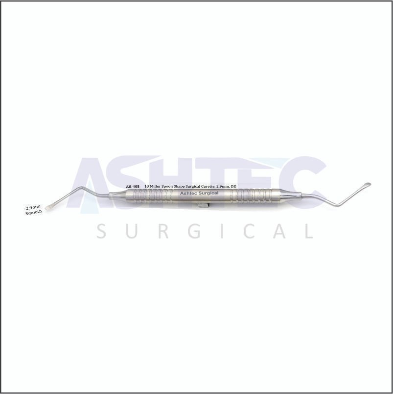 The 10 Miller Spoon Shape Surgical Curette is a double-ended precision instrument used for removing soft tissue and bone debris during surgical and dental procedures. Each end features a 2.9mm smooth spoon-shaped tip, providing excellent control and gentle curettage for precise surgical work.