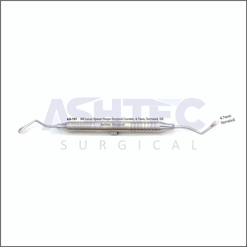 The 88 Lucas Spoon Shape Surgical Curette is a double-ended precision instrument designed for effective tissue removal, debridement, and bone cleaning during surgical and dental procedures. Each end features a 4.7mm serrated spoon-shaped tip, providing superior grip and control for efficient curettage.