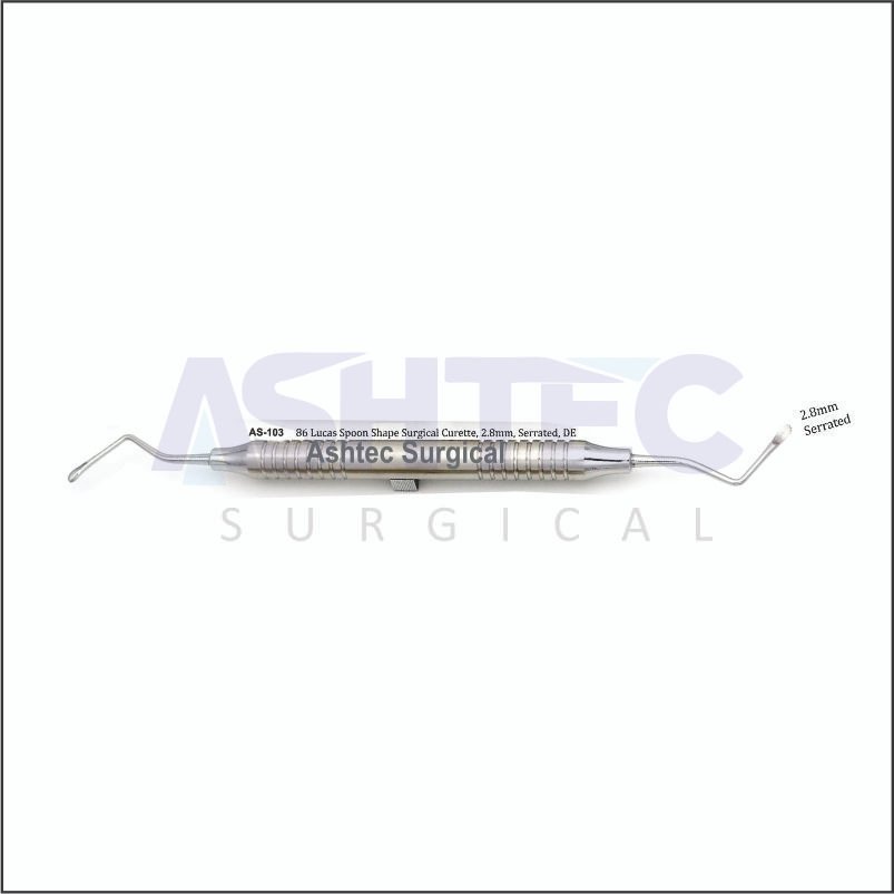 The 86 Lucas Spoon Shape Surgical Curette is a precision-crafted, double-ended instrument designed for removing soft tissue and bone debris during surgical and dental procedures. Each end features a 3.8mm serrated spoon-shaped tip, providing superior grip and control for efficient curettage and debridement.