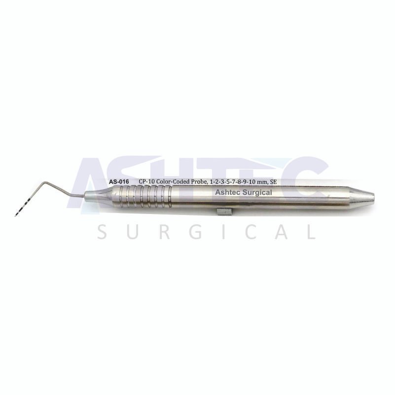 The CP-10 Periodontal Probe (1-2-3-5-7-8-9-10mm) is a high-precision single-ended dental instrument designed for accurate periodontal pocket depth measurement and gum assessment. With its clearly marked millimeter gradations, this probe provides reliable diagnostic results for dental professionals during periodontal examinations.