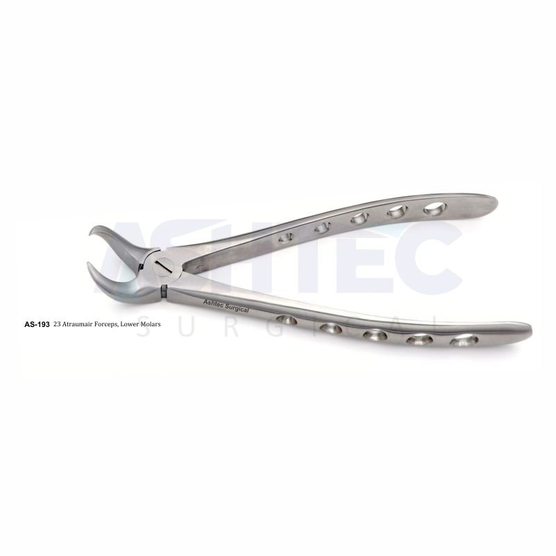 The Atraumair Extracting Forceps, Lower Molars, #23 is expertly designed for the precise and atraumatic extraction of lower molar teeth. Its anatomically shaped beaks provide a firm, secure grip on the tooth surface, ensuring smooth and controlled extractions with minimal tissue damage.