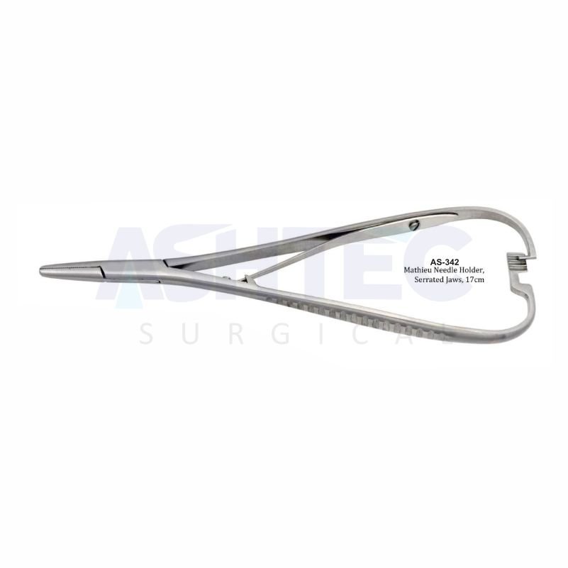 The Mathieu Needle Holder, Serrated Jaws, 17cm is a precision-crafted surgical instrument designed for holding and guiding suture needles securely during suturing procedures. Its serrated jaws ensure a firm, non-slip grip on the needle, enhancing accuracy and control. The ergonomic spring-handle design allows for easy, one-handed operation, providing maximum comfort for surgeons during long procedures.