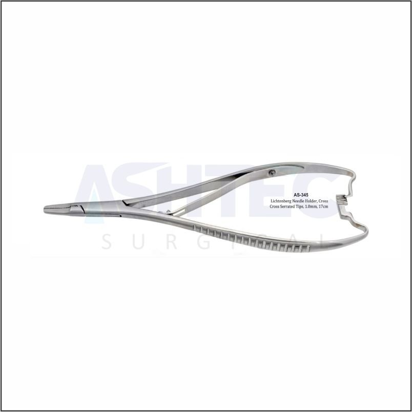 The Lichtenberg Needle Holder, Cross Serrated, 1.0mm, 17cm is a high-precision instrument designed for delicate and controlled suturing. Its cross-serrated jaws provide a secure, non-slip grip on the needle, ensuring maximum accuracy during fine surgical procedures. The slim 1.0mm tip enhances precision and maneuverability.