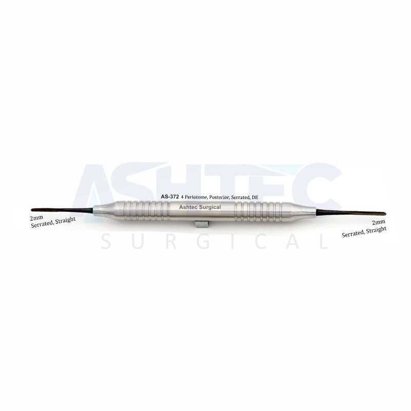 The 4 Periotome, Posterior, Serrated, 2mm, Straight, Double Ended (DE), BLACK LINE is designed for atraumatic tooth extraction and precise periodontal work. Its 2mm serrated straight blades ensure efficient cutting of the periodontal ligament while preserving surrounding bone and soft tissue.