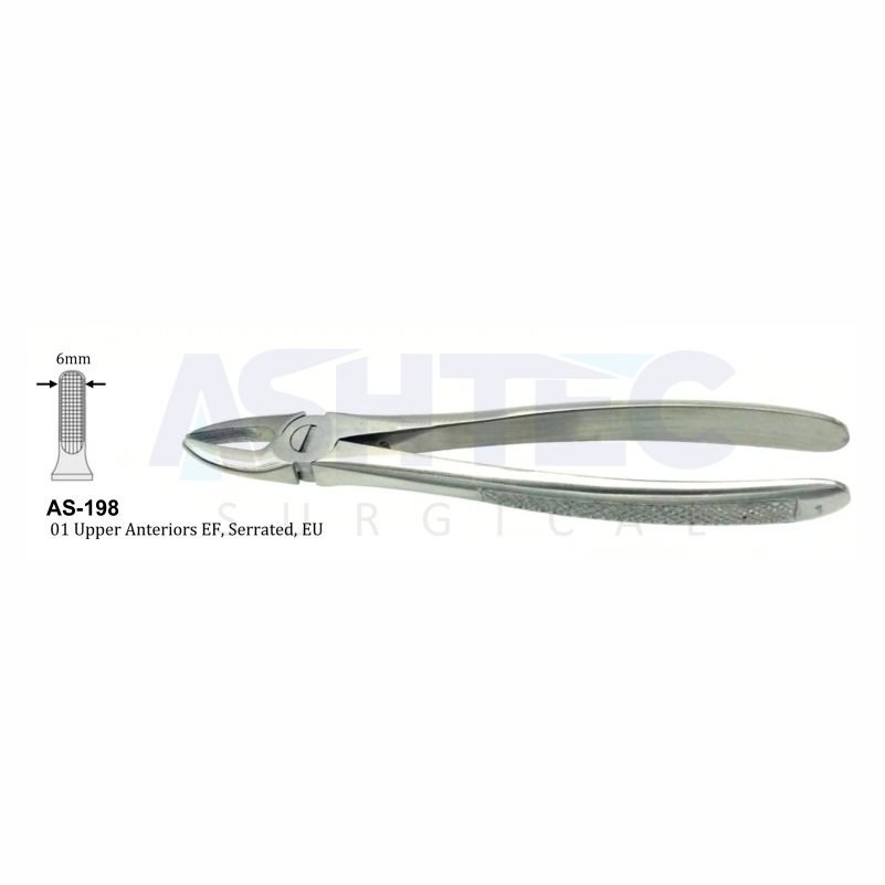 The Extracting Forceps, Upper Anteriors EF, Serrated EU, #01 is a precision-engineered dental extraction instrument designed for the safe and efficient removal of upper anterior teeth. Its 6mm serrated beaks provide a strong and secure grip, ensuring controlled, atraumatic extractions with minimal tissue damage.
