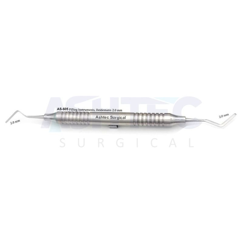 The Heidemann Filling Instrument, 2.0mm, Double Ended (DE) is a finely balanced restorative dental instrument designed for accurate placement, contouring, and adaptation of composite and restorative materials. Its slim 2.0mm tips allow for enhanced precision in fine restorative work, making it ideal for both anterior and posterior applications.