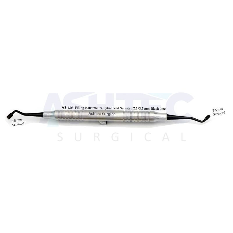 The Cylindrical Filling Instrument, Serrated, 2.5mm/3.5mm, Double Ended (DE), BLACK LINE is a premium-quality restorative dental instrument designed for packing, contouring, and adapting composite and restorative materials with enhanced grip and precision.