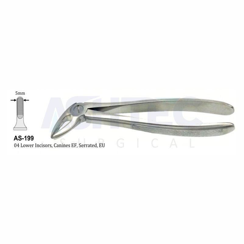 The Extracting Forceps, Lower Incisors & Canines EF, Serrated EU, #04 is a high-quality dental instrument designed for the safe and efficient extraction of lower incisors and canines. Its 5mm serrated beaks provide a firm and stable grip on the tooth, ensuring precise, controlled, and atraumatic extractions.