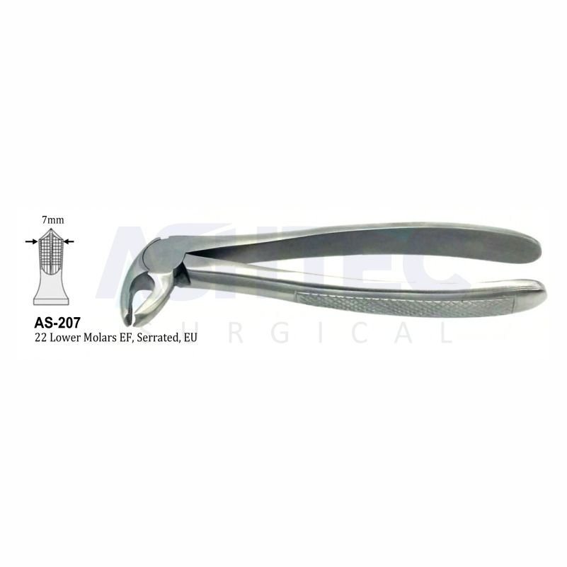 The Extracting Forceps, Lower Molars EF, Serrated, EU, 7mm, #22 is a high-quality dental extraction instrument designed for the safe and efficient removal of lower molars. Its 7mm serrated beaks ensure a secure, non-slip grip for precise control during extractions, minimizing trauma to surrounding tissues.