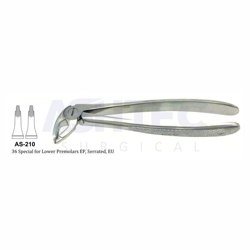 The Extracting Forceps, Special for Lower Premolars EF, Serrated, EU, #36 is a precision dental extraction instrument designed specifically for the atraumatic removal of lower premolars. Its serrated beaks provide a strong and stable grip on the tooth, ensuring accuracy and control during extraction procedures.