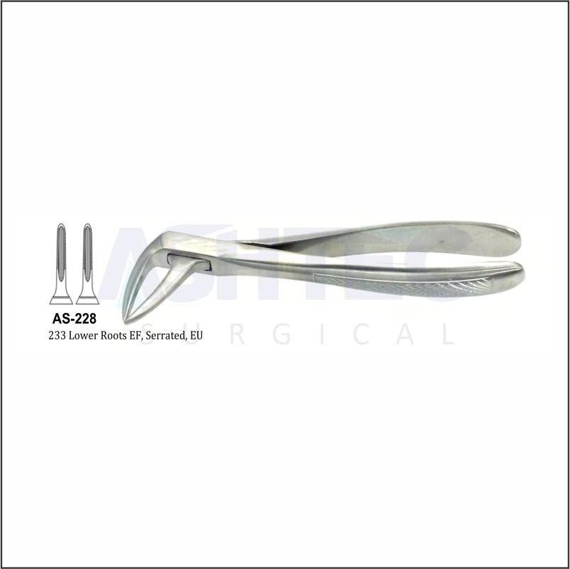 The Extracting Forceps, Lower Roots EF, Serrated, EU, #233 is engineered for the precise and atraumatic extraction of lower root fragments. Its serrated beaks provide a firm, slip-resistant grip, allowing for controlled extractions with minimal trauma to surrounding tissues.