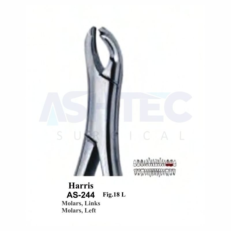 The Harris American Pattern Extracting Forceps, For Molars Left, Fig. 18L is designed for precise extraction of upper and lower left molars. Its contoured beaks provide a secure, slip-resistant grip, ensuring controlled and atraumatic extractions.