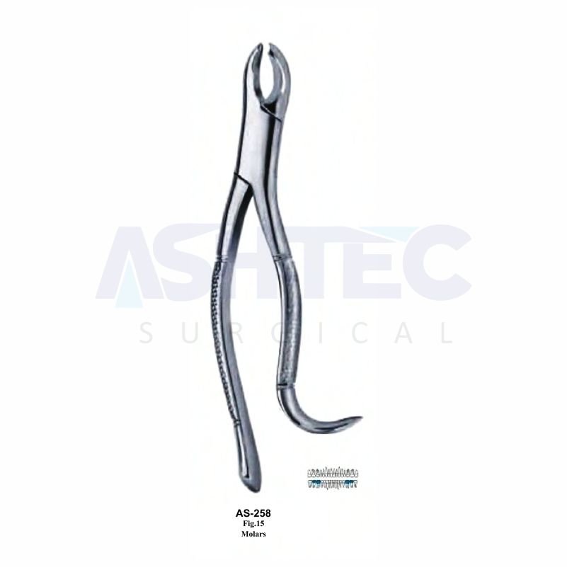 The American Pattern Extracting Forceps, Fig. 15, is designed for precise extraction of upper molars. Its contoured beaks provide a secure, slip-resistant grip, ensuring controlled and atraumatic extractions.