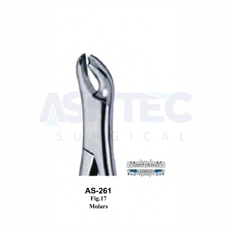 The American Pattern Extracting Forceps, Fig. 17, is designed for precise extraction of lower molars. Its contoured beaks provide a secure, slip-resistant grip, allowing for controlled and atraumatic extractions.