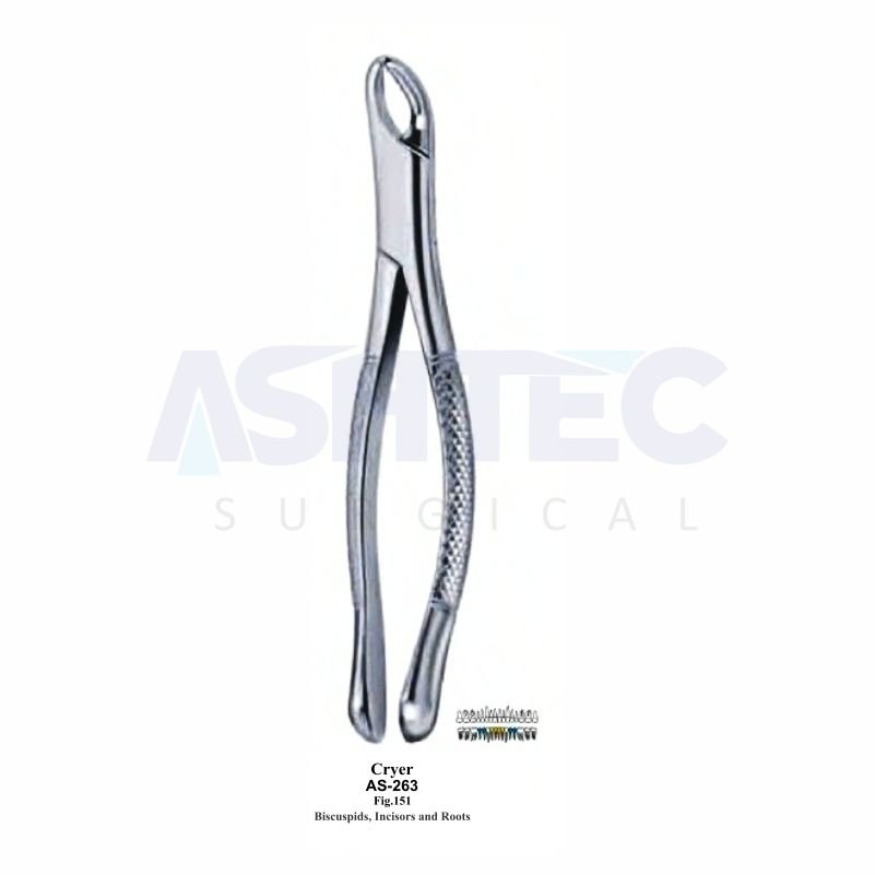 The Cryer American Pattern Extracting Forceps, Fig. 151, is designed for precise extraction of lower incisors and premolars. Its contoured beaks provide a secure, slip-resistant grip, allowing for controlled and atraumatic extractions.