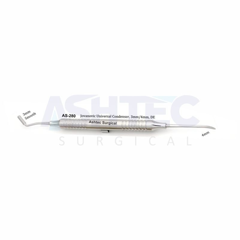The Jovanovic Universal Condenser, 3mm/4mm, Smooth, is designed for precise condensation of bone graft materials and granules in dental and surgical procedures. Its dual-diameter design (3mm and 4mm) allows for versatility, enabling controlled placement in both small and medium-sized surgical sites.