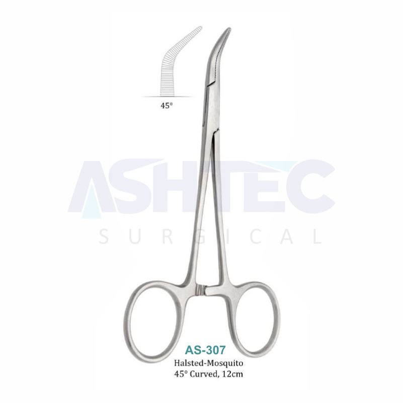 The Halsted-Mosquito Forceps, 45° Curved (12.5cm) are precision surgical instruments designed for clamping small blood vessels and controlling bleeding during delicate procedures. The 45° curved tip provides improved access and visibility in confined surgical areas.