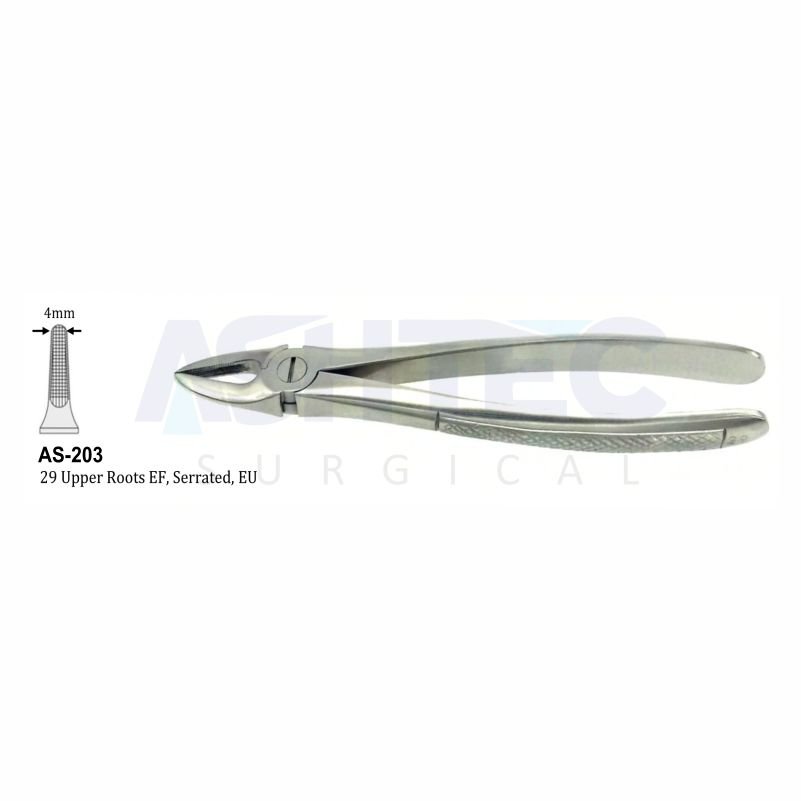 The Extracting Forceps, Upper Roots EF, Serrated EU, #29 is a precision-engineered dental instrument designed for the safe and effective extraction of upper roots. Featuring 4mm serrated beaks, it ensures a secure grip and enhanced control, allowing for atraumatic and precise tooth extractions with minimal damage to surrounding bone and tissues.