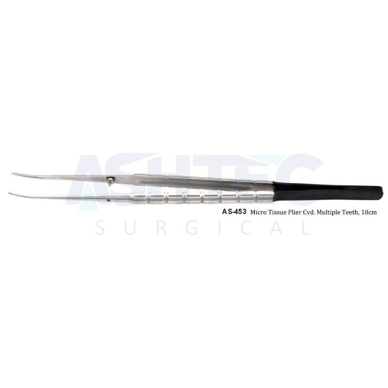 Engineered for precision and control, this Micro Tissue Plier provides a secure, reliable grip with its multiple-tooth design, ideal for delicate microsurgical tasks. The curved profile enhances maneuverability, while the Black Line coating ensures clear visibility throughout the procedure.
