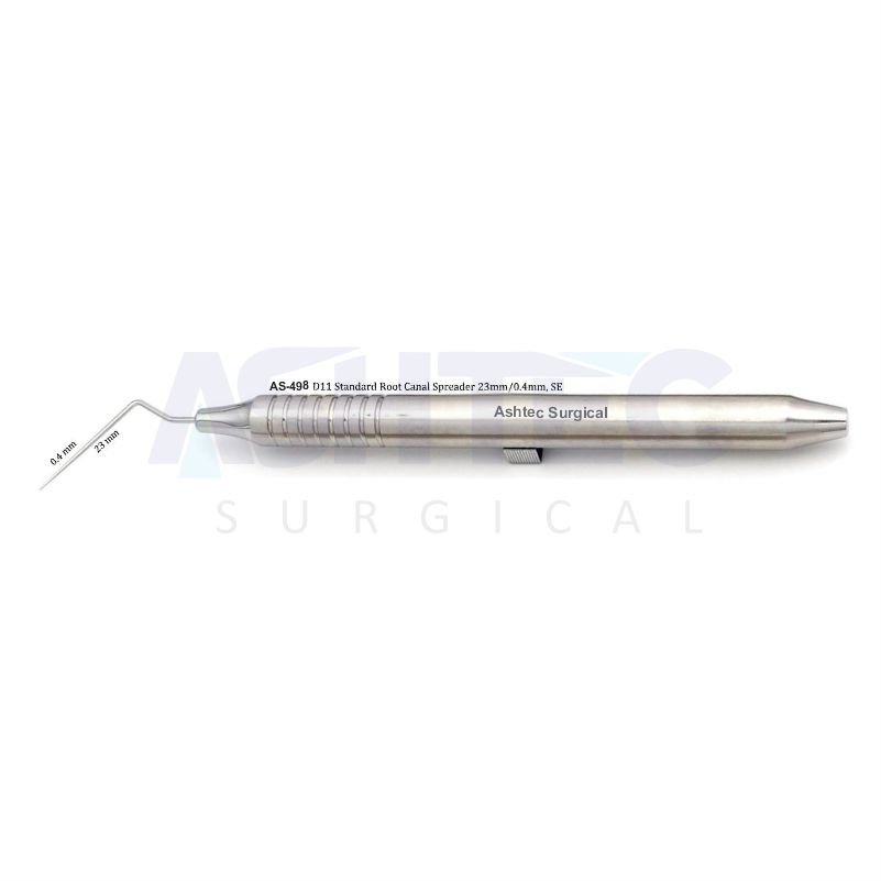 The STANDARD Root Canal Spreader, 0.4mm x 23mm, Single Ended (SE) is a high-quality dental instrument designed for lateral condensation and compaction of gutta-percha during root canal obturation. With its fine 0.4mm tapered tip and 23mm working length, this spreader ensures precise adaptation of filling materials for optimal sealing and long-lasting endodontic results.