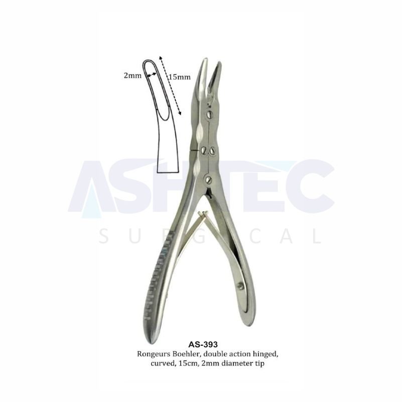 The Boehler Bone Rongeurs, Double Action, 2mm Dia Tip, 15cm, Curved are precision-engineered instruments designed for delicate bone trimming and contouring in surgical and orthopedic procedures. The curved jaws offer excellent visibility and access to confined surgical sites, while the double-action mechanism ensures smooth, controlled, and effortless cutting performance.
